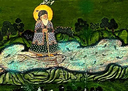 C’est en ce sens qu’il intervient par exemple auprès de Sayyidina Moussa (Moïse) dans le Coran au chapitre 18. Or, le premier Prophète vivant  avant le déluge, est Idris-Enoch et c’est lui qui est représenté par deux hommes complémentaires (toujours selon l’enseignement de Sheikh Muhyyî d-din ) : Ylias (dans son aspect Jalal) qui travaille avec le feu du ciel et Khidr (dans son aspect Jamal)  qui travaille avec l’eau. Ces deux prophètes sont les enseignants des « sciences de la Vie » (dont le souffle est l’essence).
