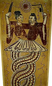 Le légendaire couple Fuxi et Nuwa, symbolisé sous la forme de serpents enlacés, représentant l'alternance du Yin et du Yang dans la manifestation