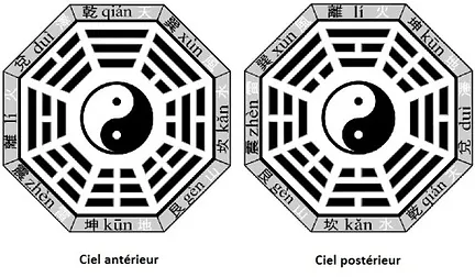 Le ciel antérieur et le ciel postérieur, correspondant respectivement à la prédisposition et à l'actualisation, où les 8 hexagrammes du BaGua sont disposés de manière différente